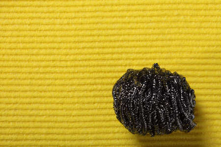 Metal sponge for washing dishes closeup on a colored background with copy space