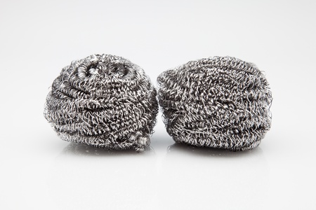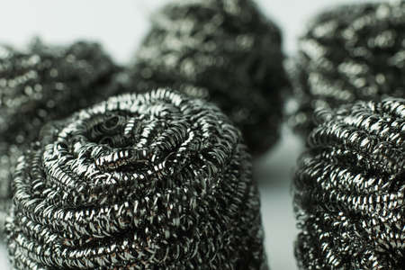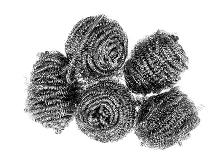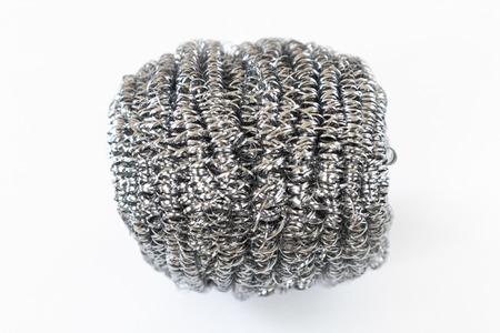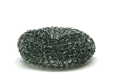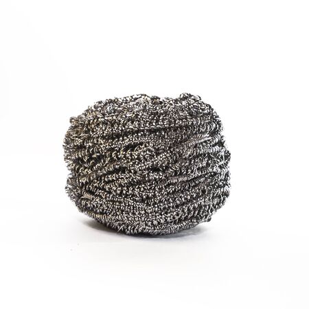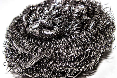 Object for cleaning. Household goods. Grater scraper metal abrasive tangle for washing dirty kitchen utensils from spiral wire on a white background