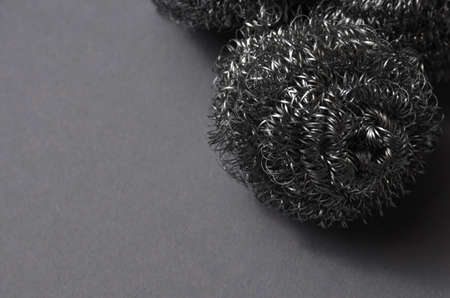 circle of steel scrubbers on grey background with copy space, top view, banner