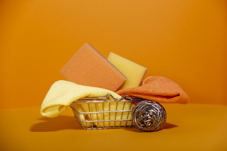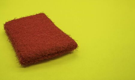 Kitchen cleaning tools, dish washing sponge and metal brush on red background insulation.