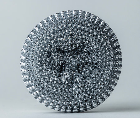 A round metal sponge designed for cleaning and scrubbing dishes efficiently