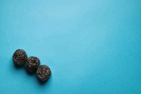 Keep your kitchen clean and fresh.Steel scrub sponges for pots and dishes on a bright blue one-color background. Close up. Blurred background.