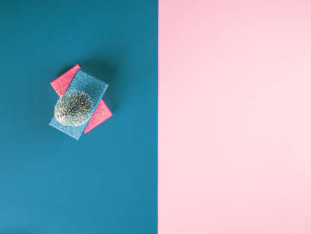 Glitter gift boxes and toy christmas tree on pink and AI Aqua 2021 trendy color split duotone backdrop. Festive winter flat lay.