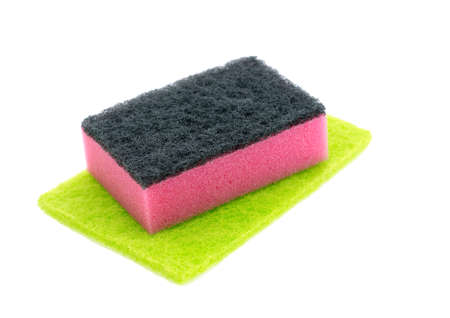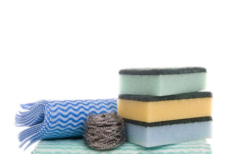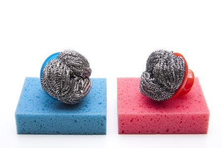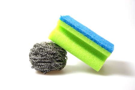 sponge, green steel wool ,sponge in net cleaning object isolate on white background.