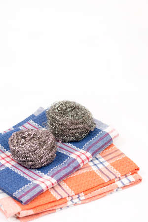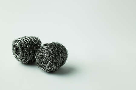 Stainless steel wool scrubbers for scrubbing pots, isolated on white background. Concept, kitchen cleaning tool. Utensil. Household.