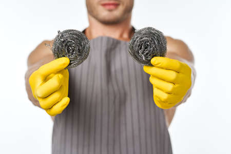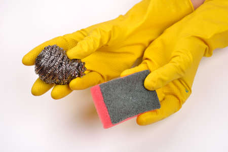 Sponge brush and steel wool on rubber gloves. Housework concept,