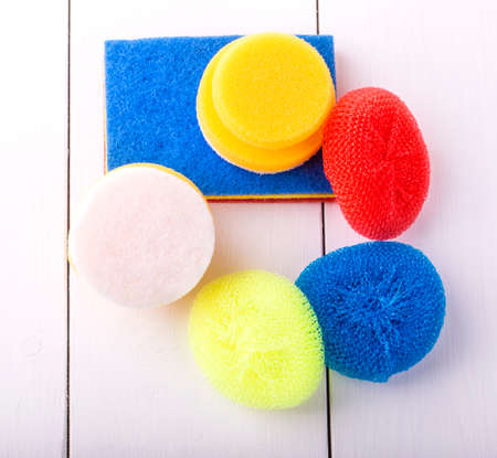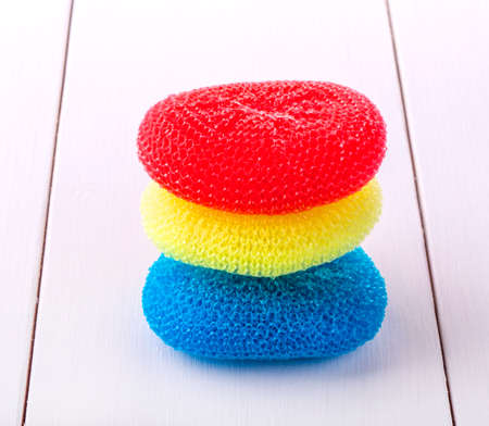 round sponges for washing dishes in different colors located on top of the white wooden table