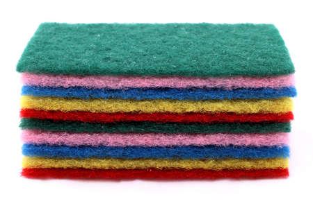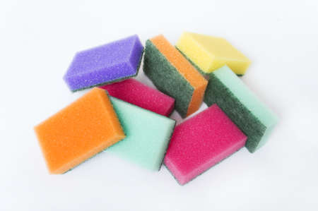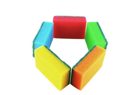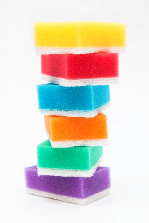 New yellow, red and blur sponge for washing dishes on a white background shot from above