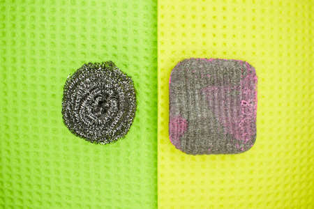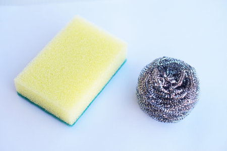 Sponges for washing dishes on a light background. Metal and soft sponge for various types of surface cleaning