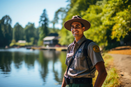 Forest ranger with green hat walking through wooded landscape and inspecting national park, generative ai illustration