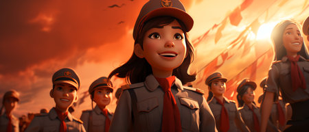 A vibrant 3D cartoon scene celebrating Armed Forces Day, featuring joyful young characters in military attire, basking in a colorful sunset backdrop.