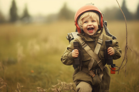 Banner African kid soldier. Child soldiers weeping with guns, SDGs, unworthy labor. Portrait of an African American child with weapons ready for war. Child abuse. safety concept, web banner
