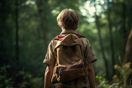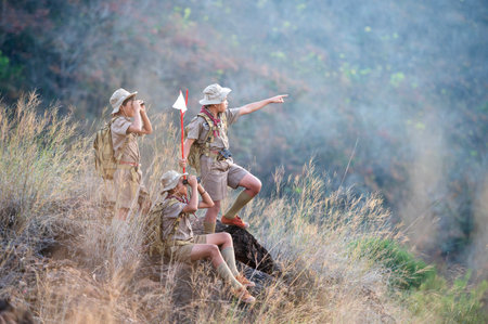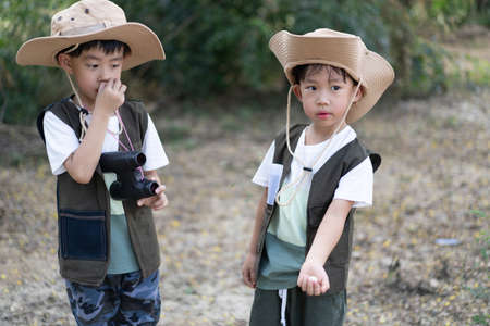 Boy Scout, a Thai Asian young boy scout in uniform exploring with binocular in the forest