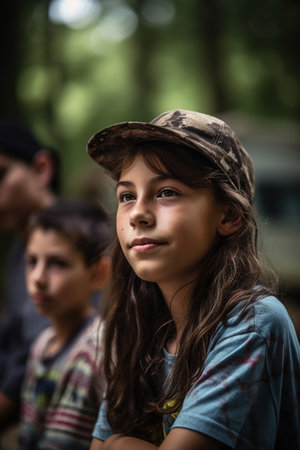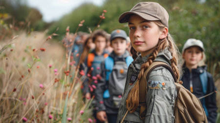 A girl leading an outdoor expedition, dressed as a ranger, with a group of boys and girls following her, learning about nature and survival skills.