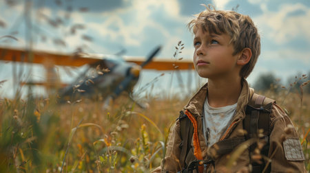 The boy dreams of becoming a pilot. The boy in front of the plane in the field.