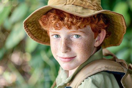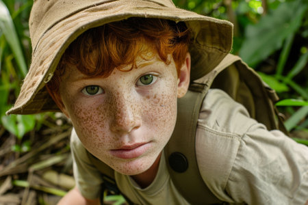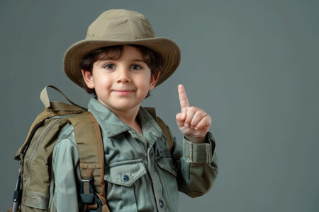 This captivating image portrays a youthful explorer adorned in safari gear, their gaze fixed intently upwards Their khaki clothing and broad-brimmed hat evoke a sense of adventure and preparedness for the uncharted wilderness The upward-pointed finger suggests a readiness to embrace discovery and ignite curiosity, inviting viewers to embark on a journey of exploration and learning amidst nature's wonders AI Generative