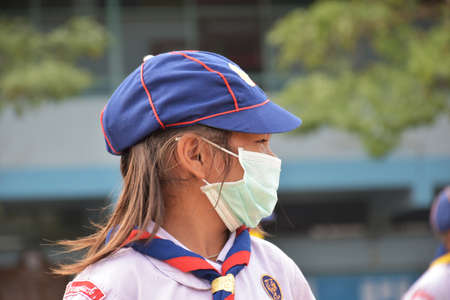 KANCHANABURI, THAILAND - MARCH 6, 2020 : Children wear masks at the Scout Day Camp activities held during the news of the covid-19 virus outbreak.