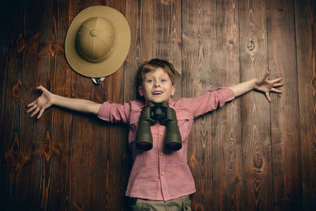Young boy child playing pretend explorer adventure safari game outdoors with binoculars and bush hat