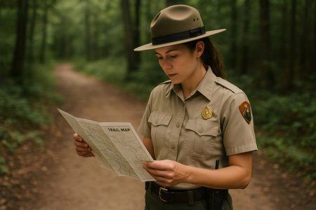 Park ranger examining a trail map while standing on a forest path, surrounded by lush greenery, highlighting outdoor exploration and navigation