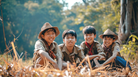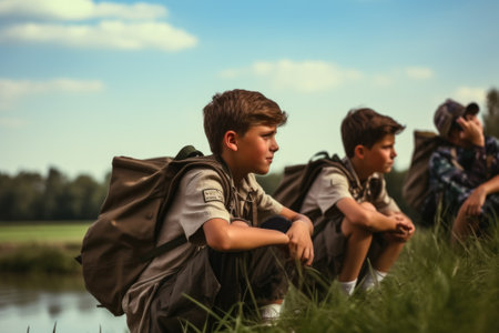 A group of young boys sitting together next to a peaceful river. Perfect for capturing the essence of friendship and the beauty of nature. Ideal for use in travel brochures, outdoor adventure promotions, or family-oriented advertisements.