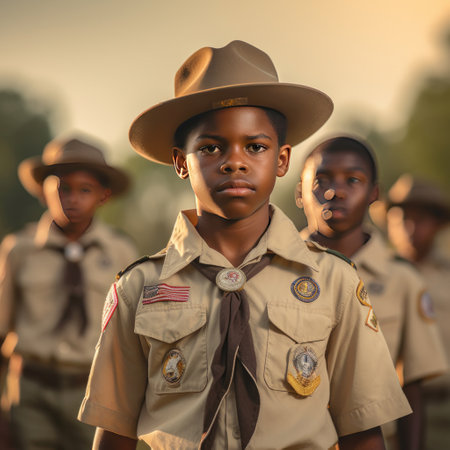 American Boy Scouts in uniforms running in a field. genarative AI.