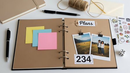 Desk scene with notepad, sticky labels, and open planner under soft lighting