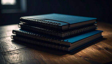 Stacked spiral notebooks in multiple bright colors placed diagonally on wooden surface, back to school preparation mood
