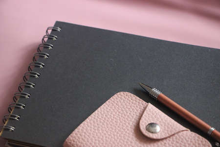 Workspace with spiral copybook, pink leather wallet, and pen. Business management or education concept template with copyspace.