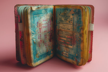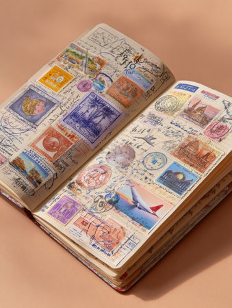 Colorful travel journal showcases detailed stamps and handwritten notes documenting experiences from multiple locations, capturing the essence of adventure.
