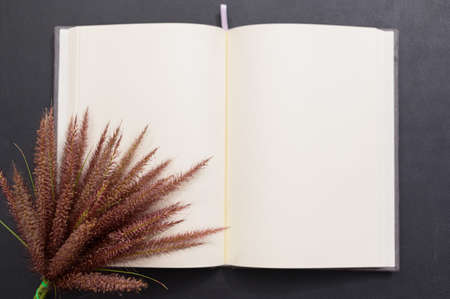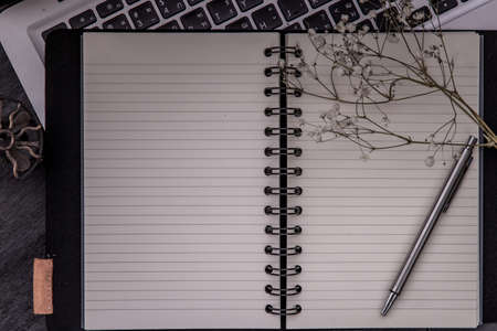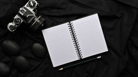 Top view of opened blank notebook, pencil, camera and decoration on black table
