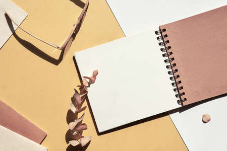 Mockup with blank album, notebook with spiral binder. Reading glasses, dry eucalyptus twig. Flat lay on layered golden and off white paper. Natural sunlight, shadows. Recycled low impact materials.