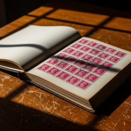 Harsh light illuminates an open, vintage stamp collector's album displaying meticulous rows of pink