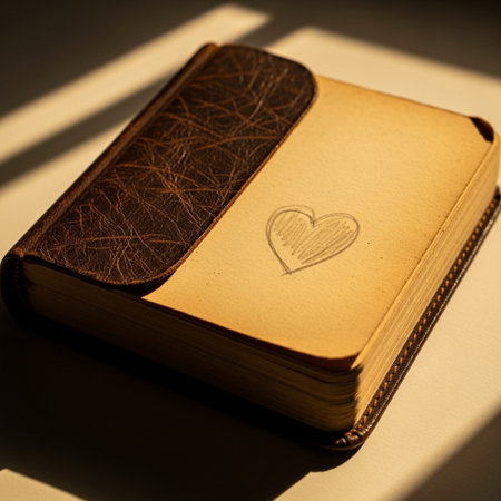 Side profile silhouette of a worn leather journal open to a page with a faint pencil heart doodle.