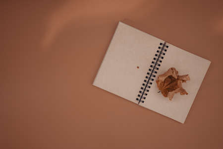 Minimalism autumn composition. Dry leaf with notebook on paspel brown background with shadows. Top view. Atmospheric fall flat lay. Abstract nature backdrop created by sunlight and shadows. Copy space