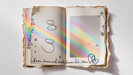 Open sketchbook reveals vibrant rainbow reflections and artistic doodles inside.
