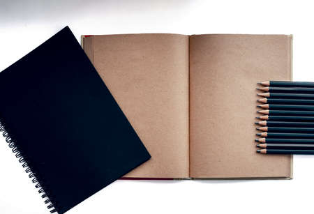 Black and craft sketchbooks with pencils for hatching on a white isolated background. Tools of a professional artist. Top view