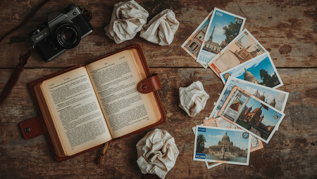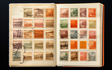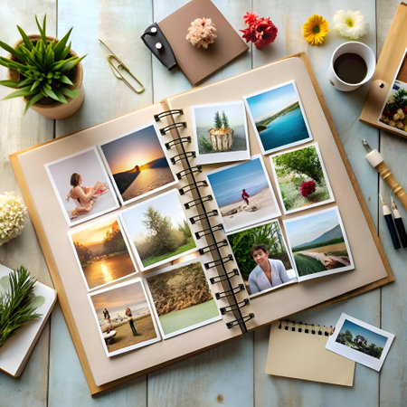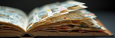 A vintage photo album filled with snapshots of happy memories. Capture the joy of nostalgia with this evocative image. perfect for travel. family. and scrapbooking projects.