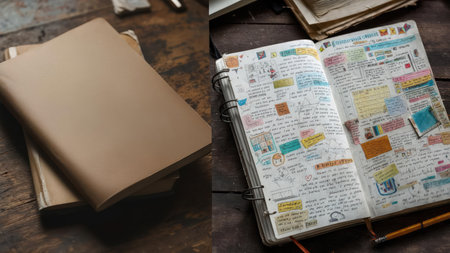 Colorful artistic journal with handwritten notes and illustrations. That the image is generated using AI.