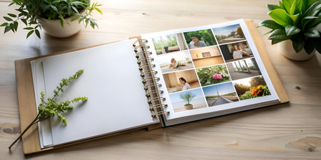 A classic photo album mockup showcasing blank pages and various captivating photo inserts. Perfect for showcasing your photography or design projects. creating a warm and nostalgic feel.