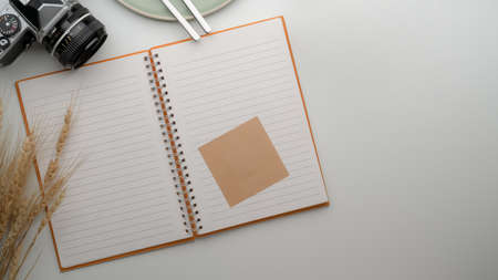 Top view of open blank notebook with sticky note on dinning table with camera, plate, silverware and copy space