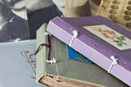 Family traditions, memore and nostalgia concept. Vintage photo frame and old photos on faily album on wooden board background.