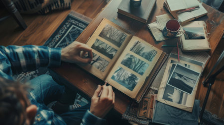 A person sits at a table, carefully looking through a photo album filled with old photographs of a forest. The warm lighting creates a sense of nostalgia and the images evoke memories of peaceful nature walks.