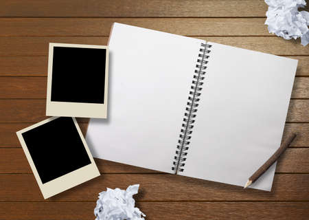 Open vintage photo album book with blank paper pages and with copy space for image or for text laying in fallen autumn leaves and retro photos of peoples with no faces on wooden desk table surface background.
