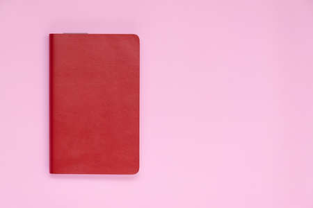 Red leather cover book on pink background with copy space. Top view, flat lay minimal working space.