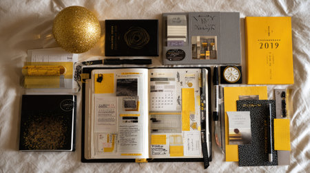 This image features a vibrant and organized planning layout with gold, yellow, and black stationery items. Perfect for inspiring productivity and creativity in your workspace.