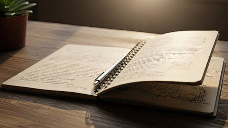 An open notebook with a pen rests on a wooden table, suggesting a setting for writing or planning. The image showcases warm, natural tones and textures. The composition, lit by overhead lighting, presents a top-down view. This image is suitable for various commercial uses, including articles and marketing materials.