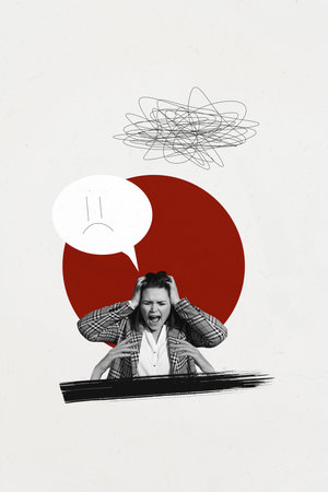 Vertical collage stressed crazy woman shout mind mess problems mental disorder freak hands body fragments textbox psychology therapy