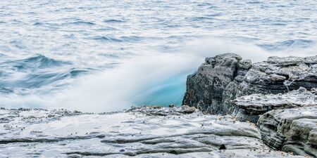 Waves breaking on the shore rocks with sea foam, Mallorca