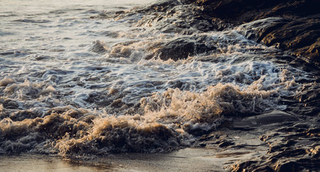 a detail of a wave breaking against the shore in a slight tint.