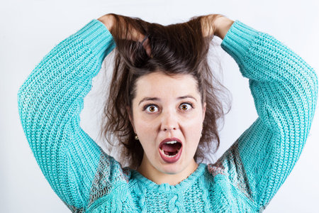 Pop-eyed girl in shok with open mouth and standing up hair, on a white background.